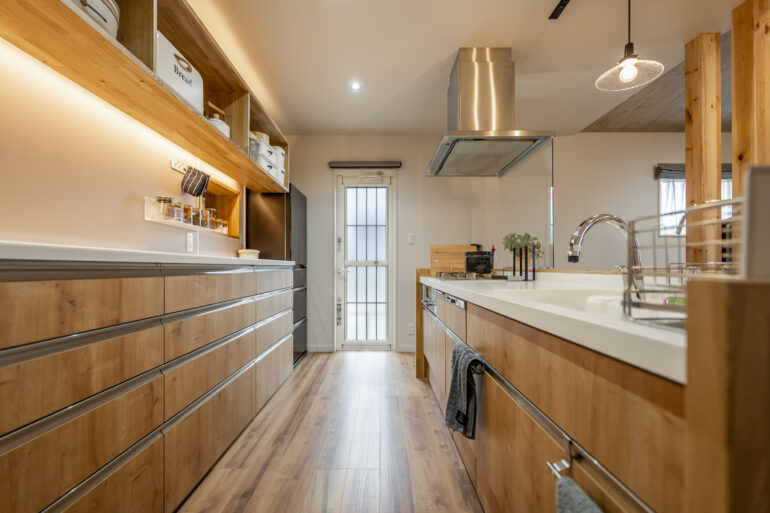 2023.08.26 「熊本の注文住宅」施工事例のご紹介☀ アイ-ウッドブログ 素敵なキッチンの施工事例をご紹介します♪ アイランドキッチンを採用(*^▽^*) 木目調で統一し、暖かみのあるキッチンになっております☀ コンロの前には、スクリーンを付けることで油はねを防げます◎