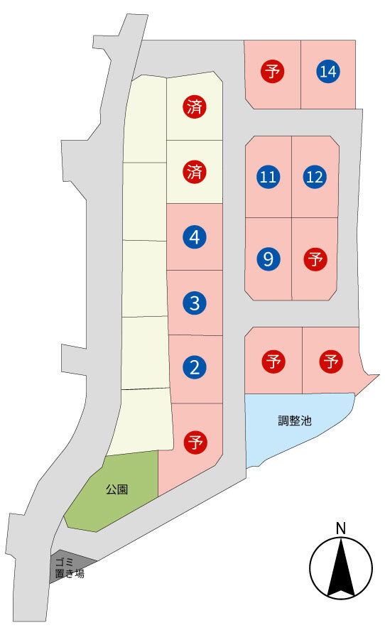 | 13号地 | 215.57㎡(65.20坪) | 2,530万円 | 予予約中 |