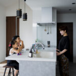 居心地の良いホテルライクなM邸は、練りに練った動線も完璧だ。LDK以外の空間は壁の裏に隠れているので、来客時もプライベート空間をさらすことはない。洗濯から収納までコンパクトな動線のランドリーに、大量の靴が収まる玄関収納、デザインにこだわった造作の洗面台に、半透明の扉で程よく隠れるキッチン棚、生活感を隠すための各所の収納……。「一つひとつの打ち合わせに、思い出があります」と奥さまは振り返る。