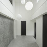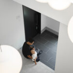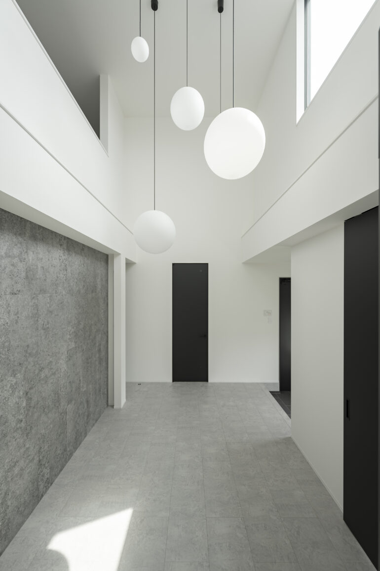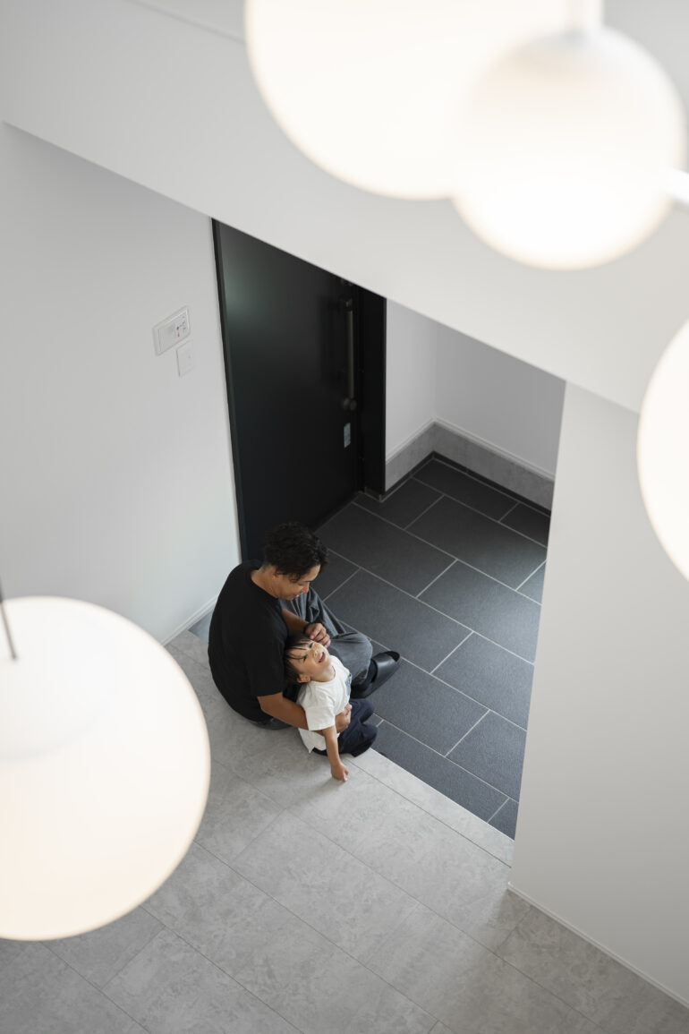 住宅街の中でもひときわ目を引く、黒を基調とした箱形のH様邸。リゾートホテルのようなタイル貼りのアプローチを進み玄関をくぐると、誰もが思わず「わあ」と声を漏らすだろう。そこには、見上げるほどの吹き抜け空間に円形の美しい照明が下がる、非日常の広がりがあった。玄関ホールだけでも一部屋として成立しそうなスケール感だ。ご主人は「玄関に入った瞬間に感じる非日常にずっと憧れていたんです」と目を輝かせる。