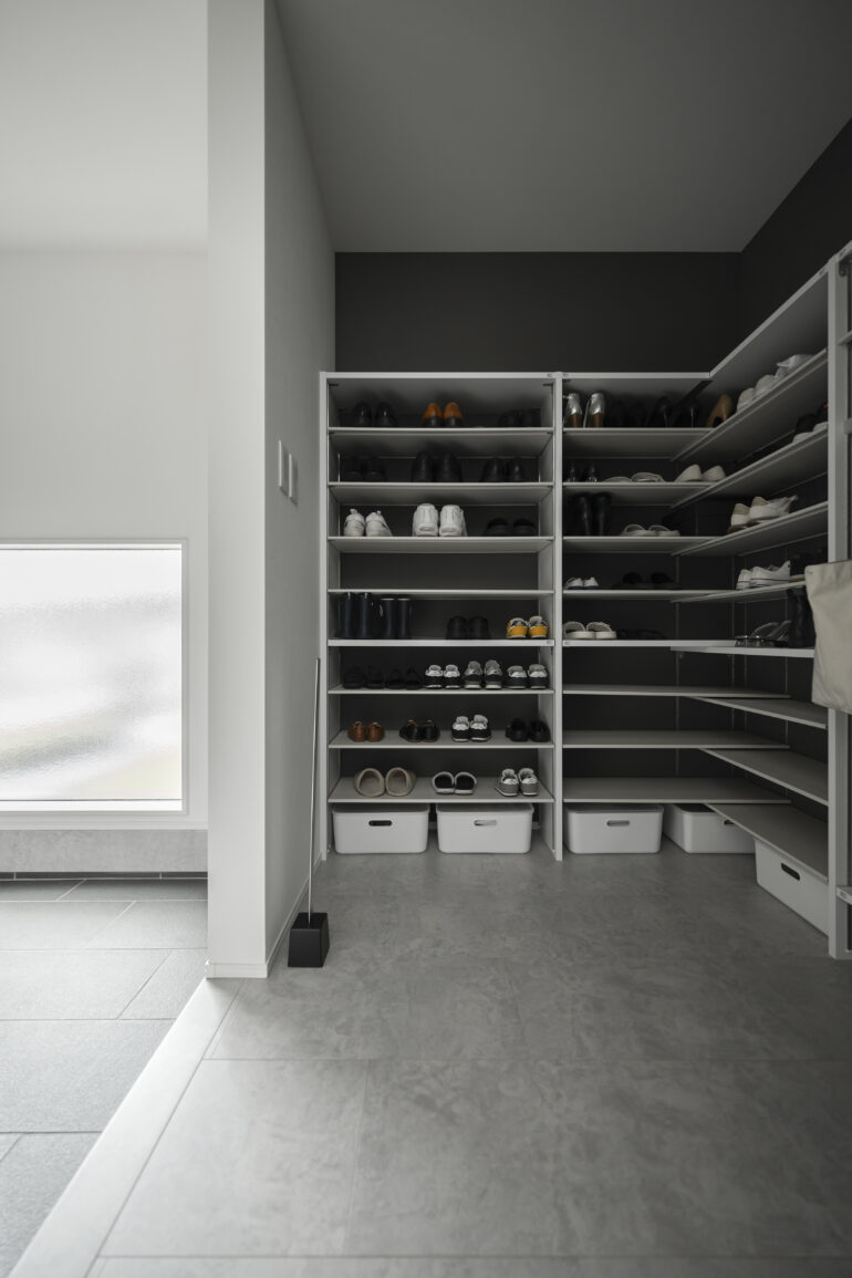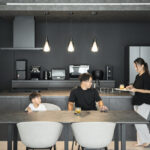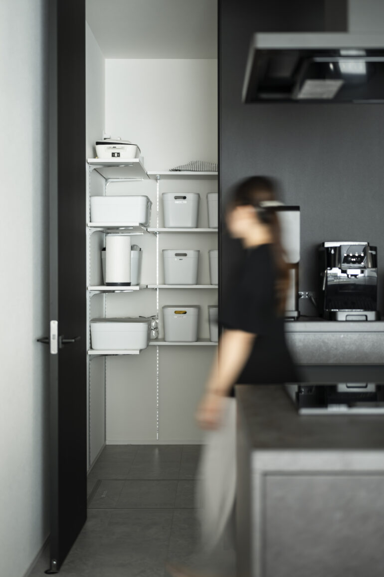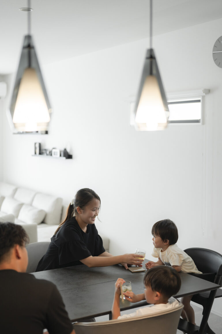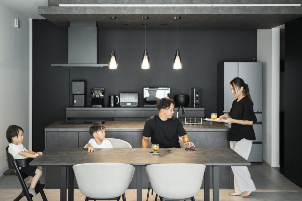 夫妻のこだわりが隅々にまで息づく、2階建てのモノトーンの住まい。白・黒・グレーの3色に色味を絞り、木目調の素材は一切使用せず、ドア下の見切り材すら省いた。極限まで装飾をそぎ落とした空間は、まるでデザイナーズホテルのような佇まい。そして子ども2人を育てているとは思えないモノの少ない暮らしも、徹底した収納計画の賜物だ。「広いシューズクロークや隠し扉のパントリーなど、モノを隠せる“居場所”づくりにこだわりました」とご主人。収納を空間に溶け込ませる工夫の積み重ねが、デザイン性と暮らしやすさを両立させた機能美を生み出している。