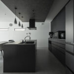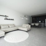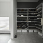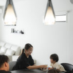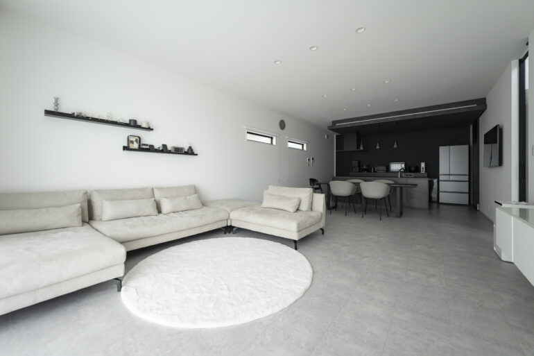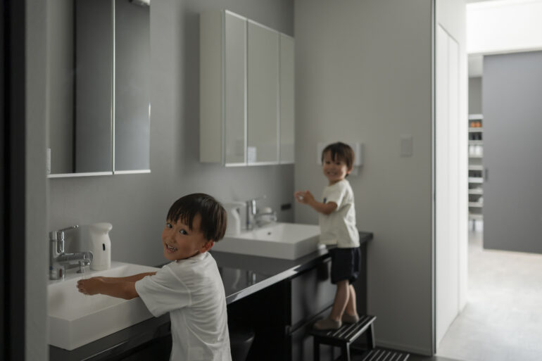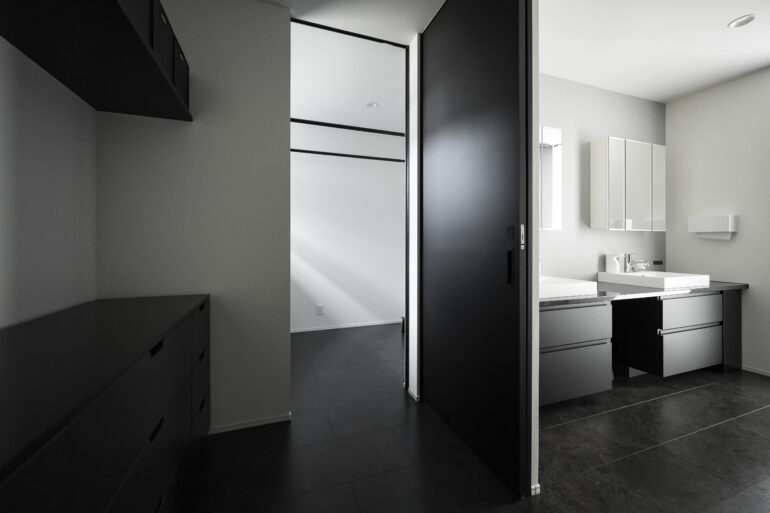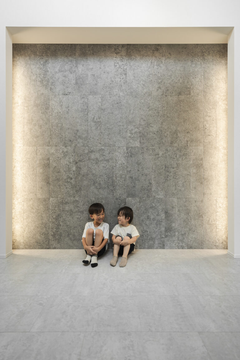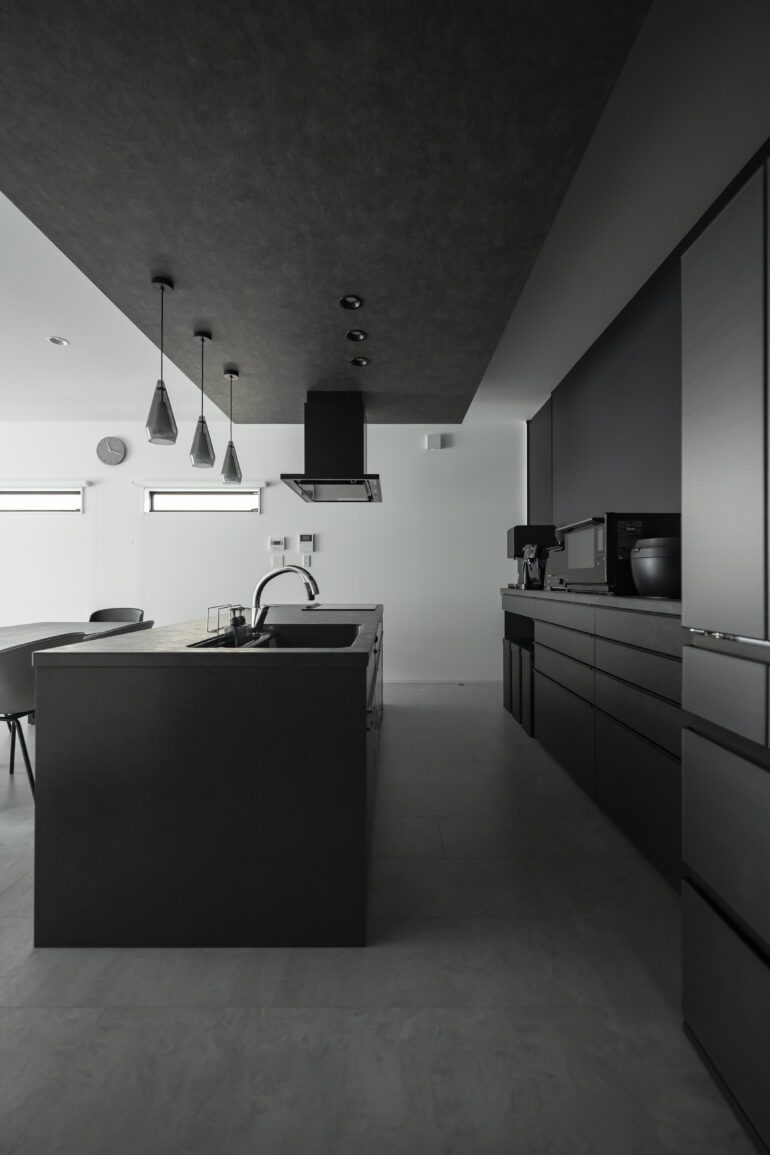 夫妻のこだわりが隅々にまで息づく、2階建てのモノトーンの住まい。白・黒・グレーの3色に色味を絞り、木目調の素材は一切使用せず、ドア下の見切り材すら省いた。極限まで装飾をそぎ落とした空間は、まるでデザイナーズホテルのような佇まい。そして子ども2人を育てているとは思えないモノの少ない暮らしも、徹底した収納計画の賜物だ。「広いシューズクロークや隠し扉のパントリーなど、モノを隠せる“居場所”づくりにこだわりました」とご主人。収納を空間に溶け込ませる工夫の積み重ねが、デザイン性と暮らしやすさを両立させた機能美を生み出している。
