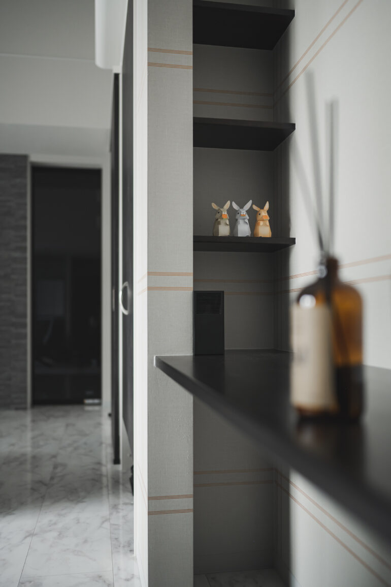 住宅街の中で存在感を放つ、モダンな外観の家。その迫力ある立ち姿は2階建てに見えるが、実は平屋の住まいだ。中に入ると、モノトーンのホテルライクな洗練空間。かといって無機質な冷たさはなく、むしろほっと居心地がいい。「間取りから内装まで、一つひとつ丁寧に考えたんですよ」とご主人は誇らしげに家を案内してくれた。