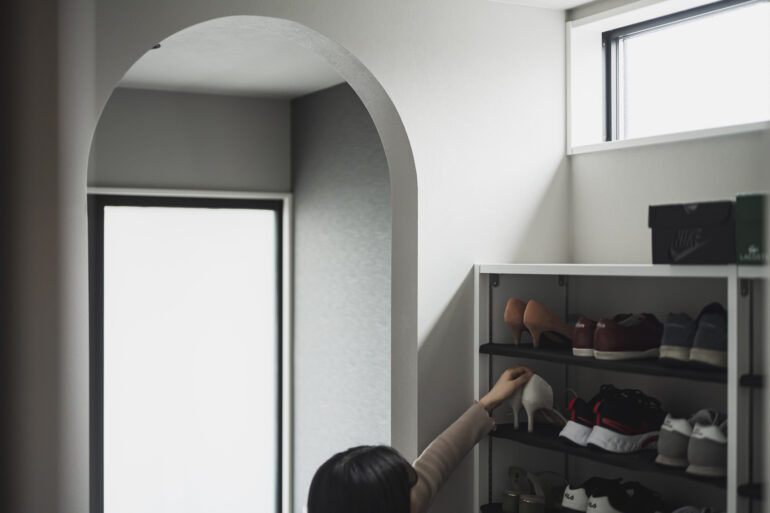 中心にある25畳の広いLDKを囲むように生活動線が巡るN邸。キッチン脇からランドリールーム、ファミリークローゼット、玄関収納を経て玄関へとつながる周回性のある動線は、朝の支度や洗濯のしやすさで大活躍だ。憧れのアイランドキッチン脇の広いパントリーや各所の収納も、位置や広さを熟考の末に設けたもの。「玄関収納は既製の棚を入れたくて、サイズを合わせて作ってもらいました。それに壁に補強材を入れてもらった場所もたくさんあります」と奥さま。住み始めてから暮らしに合わせて、DIYで棚を作れるようにとの工夫だ。