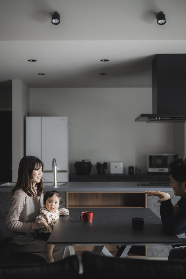 夫妻と9ヵ月の娘さん、2匹の愛猫とが、 心地よく暮らす、モダンな家。