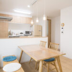 2階のご自宅は奥さまのご希望に沿ったもの。約17帖のLDKはシンプル&ナチュラルなイメージで統一されてあり、本当におしゃれ! 「以前の家はダークブラウンで統一していたんですが、新しい家はライトブラウンな雰囲気に。新居に合わせていろいろインテリアも揃えてみました」と笑顔で話します。キッチンから一直線につながるLDKには子供部屋が2室隣接。「必ずリビングを通って部屋に行く間取りになっています。子供たちが部屋にいても、リビングと近いので何かと安心ですね」。ほかはウォークインクローゼットを備えた夫婦の寝室、浴室・脱衣室、収納スペースなど。なかでも、3口のIHクッキングヒーターを採用したキッチンは掃除がしやすく、奥さまのお気に入りスペースに。余分なものを省き、必要なものだけを厳選した間取りに対して、「コンパクトで生活しやすい。本当に気に入っています」と語ってくれました。